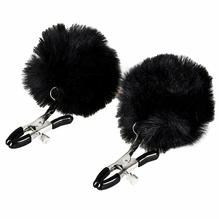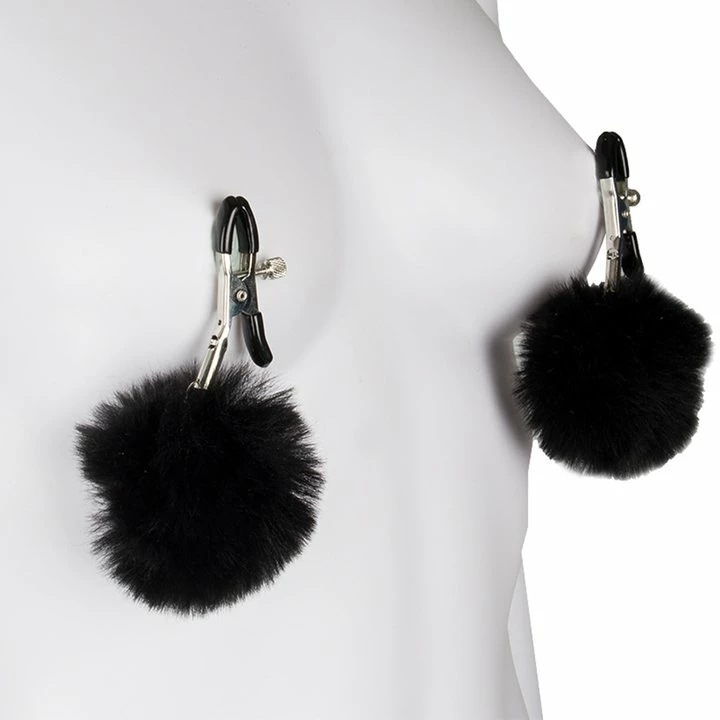 β’ The black, furry pompoms add a fun twist to your tortured nipplesΒ