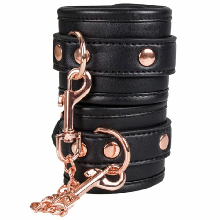 Bind your partnerโs wrists with the Bound Rose Gold Faux Leather Handcuffs from Bondara. This high-quality set of restraints is made from PU leather and features a velvety-soft lining for comfortable wear โ perfect for longer bondage sessions! Giving the classic black a stylish twist, rose gold creates a stunning finish that both of you are bound to love.ย