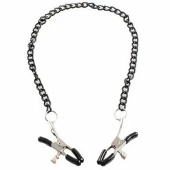 Indulge in nipple play during all manner of sexual play with these fantastic Chained Up Nipple Clips from Bondara. These silver metal slider clips are made of a two prong clip that has a sliding ring to tighten or loosen the pressure of the black rubber tips that hold your nipple firmly. These clips are easy and safe to use and can add a whole new element of stimulation into your sex life. Both clips are connected via a silver metal chain that works to weight the clamps slightly, for a more intense feel and an undeniably erotic appearance.ย
