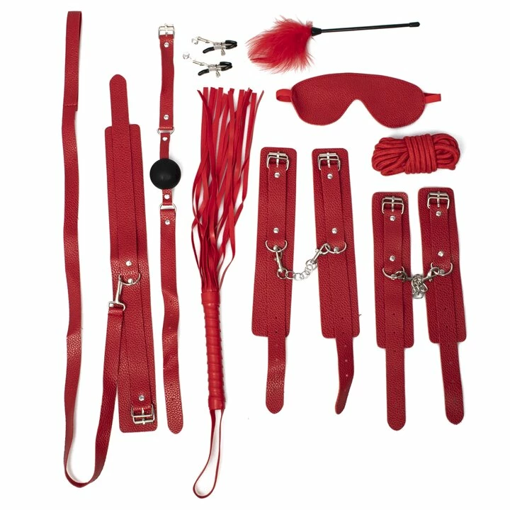 Take it to the next level with the ball gag and blindfold, and ensure your partner is never far from your side with the collar and leash. Finally, the nipple clamps and flogger let you add new sensations for even more excitement.