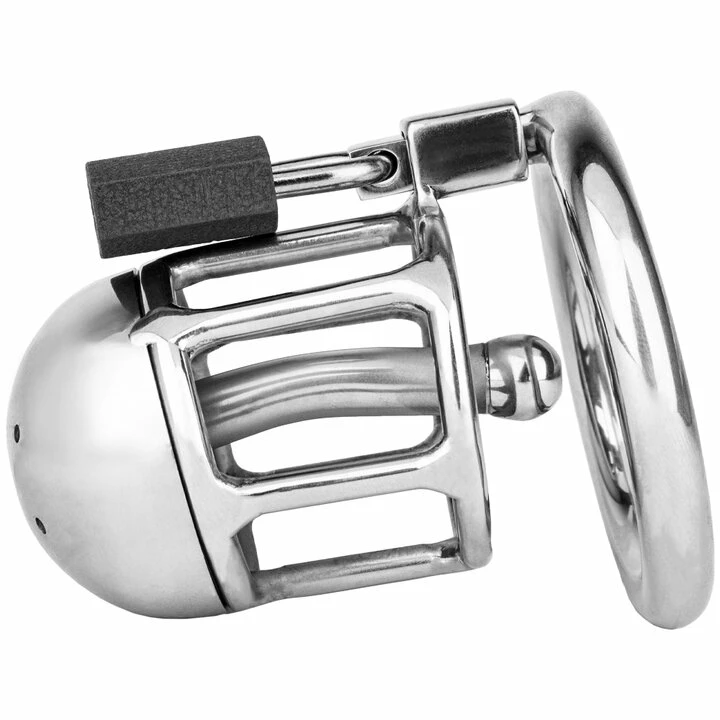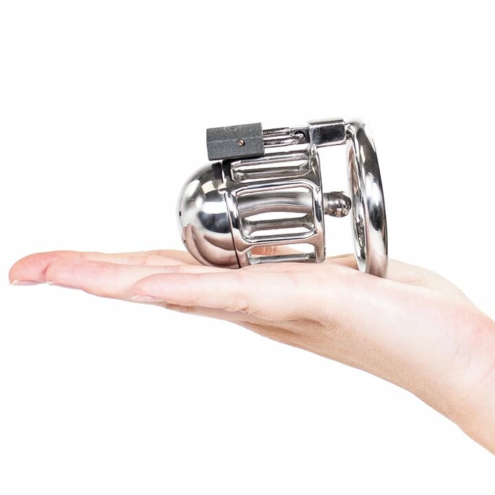 A punishing solution for subs who won’t stop touching their tackle; satisfy your sadistic side and leave him begging for pleasure – just don’t lose the keys! Suitable for beginners and beyond with an open, ventilated design, this extra small cock and ball device confines the most minuscule of willies, forcing them to stay flaccid in just 2.4-inches of confinement for thrilling orgasm denial. Add to your sub’s humiliation with the torturous arousal of the built-in penis plug.ย
